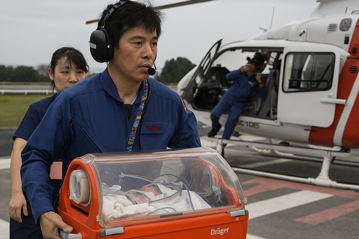 平川英司(ひらかわ えいじ)医師は、熊本地震時にDMAT等の災害医療チームと情報共有・連携し、体重1000g未満の赤ちゃんを含む搬送を短時間で連続実施。報道では18時間・11フライト、2日間で10人(母親含む)を県境を越えて搬送した記録が示されています。