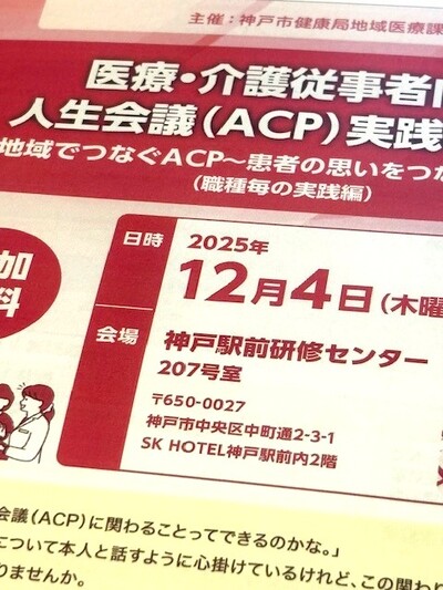 神戸市では、人生の最終段階における医療・ケアの意思決定支援を広げるため、2025年12月4日(木)に医療・介護従事者向けの人生会議(ACP:アドバンス・ケア・プランニング)実践報告会を開催します。