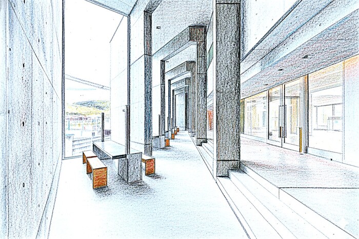 細尾氏は、不規則な敷地を活かすために「3層の構成」を考案しました。 1層目(外側)は、倉庫やトイレなど窓のない諸室を配置した機能的な層。 2層目(中間)は、学生が移動し交流するチューブ状の主動線エリア。 3層目(内側)は、実習室や講義室など、光が差し込む開放的な空間。 これらが重なり合うことで、まるで「織物」のような複雑かつ調和の取れた空間が生み出されています。