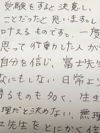 <受験生の方へ>受験をすると決意し、その一歩を踏み出すということは、とても勇気のいることだったと思います。しかし、夢は見るものでもなく、語るものでもなく、叶えるものです。一度きりの人生です!! 何歳でも「まだ間に合う」と思って行動した人が間に合います。自分を信じ、富士先生を信じて行動し、夢に向かってください!! 何もしない日常より、夢や目標に向かって努力する日常は得るものも多く、生きている実感が湧きます。無理だと決めない、無理だと思わない、これだけで人生は変わります! 富士先生をとにかく信じてやることです。言い過ぎかもしれませんが、本当に先生のおかげで夢に近づけました!ありがとうございました。感謝しています。